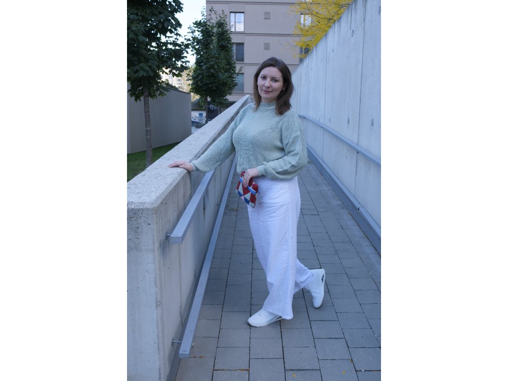 Voľné široké nohavice s vysokým pásom, vreckami a pohodlným strihom, ktoré ti ušijeme na mieru z látky podľa výberu – ľan, bavlna alebo riflovina.